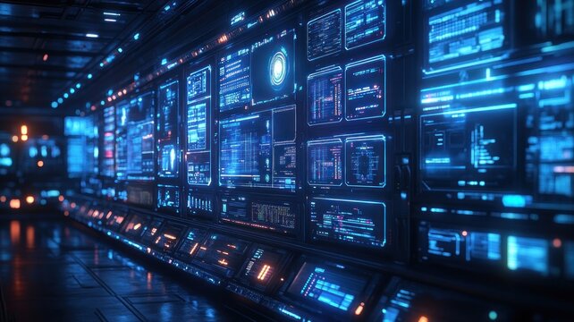 A dynamic digital wall filled with multiple data screens in a high-tech control room, showcasing a futuristic environment with cool blue tones and an immersive atmosphere.