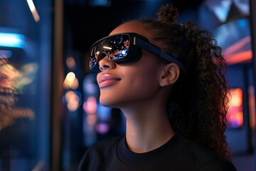 Woman immersed in futuristic vr experience