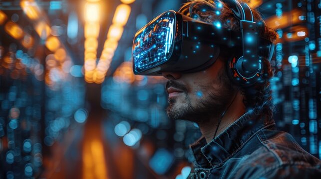 Man wearing virtual reality headset in a futuristic data center with glowing lights and cables, exploring digital spaces and immersive technology.
