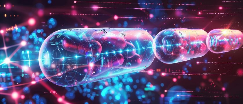 Futuristic conceptual image of virtual reality representation of pills and data streams, symbolizing advanced technology in medicine.