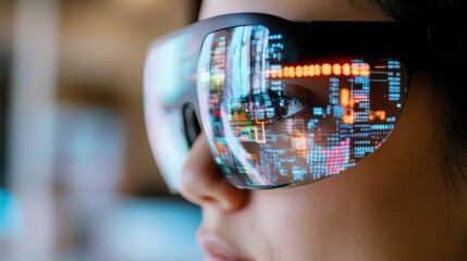 Reflections of vivid data streams across futuristic VR glasses, as a person delves into an immersive digital world.