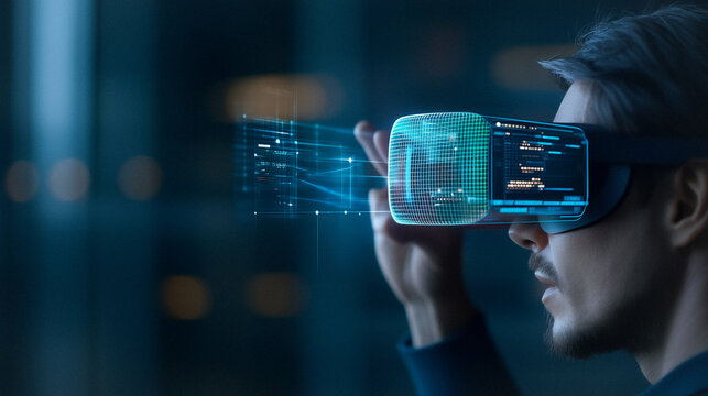 VR Innovation: Man in a VR headset, immersed in a futuristic digital interface, experiencing cutting-edge virtual reality technology, with emphasis on advanced technology and innovative digital world.