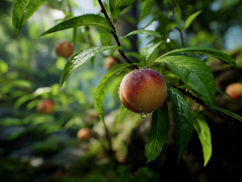 Close-up of large immortality peach with dewdrops in magical forest with blurred background, Chinese mythology fruit tree in fantasy woodland, mystical oriental scene with detailed water droplets