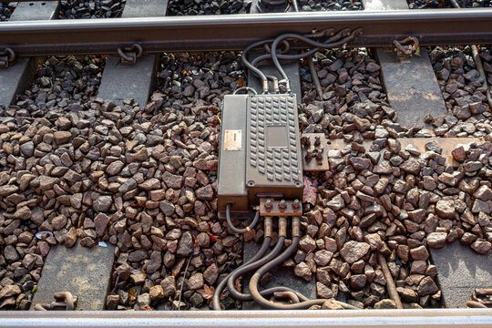 Electronic components on printed circuit board detail. Close-up of capacitors, inductors and rectangular transformer with protruding insulation grooves in copper wire winding. Electrical engineering.