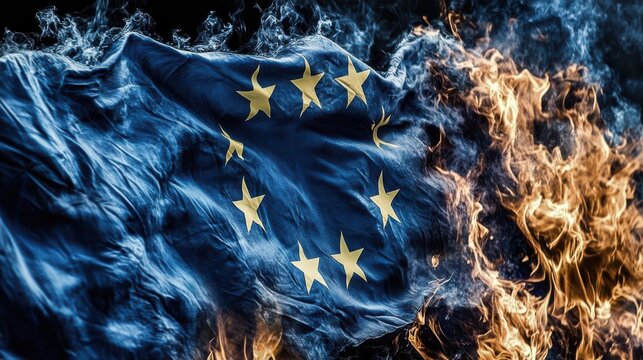 The European Union flag is engulfed in flames, symbolizing conflict and the tumultuous political landscape in Europe, evoking strong emotions of division.