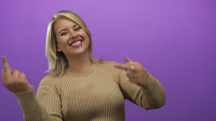 Young blonde woman wearing tan sweater shows middle finger while smirking at camera and raising eyebrow in studio; defiance.