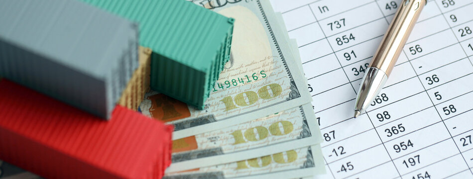 Global business container cargo ship in import export business logistic. Company shipping and logistics in United States with dollar money bills and pen close up