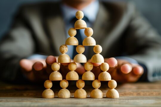 Building a Strong Foundation: A businessman's hands carefully protect a pyramid of wooden figures, symbolizing the importance of teamwork, leadership, and collaboration in building a successful organi