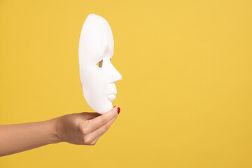 Profile side view closeup of woman hand holding white facial mask model, hiding personality. Indoor studio shot isolated on yellow background.