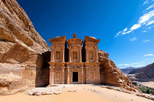 Ad Deir, monumental facade, towering rock-cut architecture dominates the Petra landscape with its impressive size and grandeur