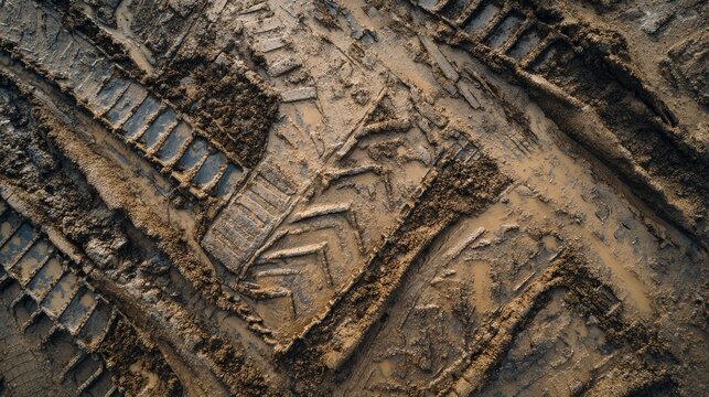 Footprints and tire tracks imprinted on muddy terrain after rainfall creating a textured surface