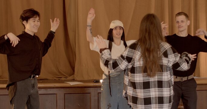 Teacher With Male And Female Drama Students At Performing Arts School In Studio Improvisation Class