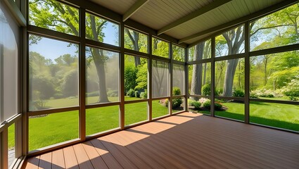 Modern screened porch enclosure with plastic windows and composite floor with summer wood