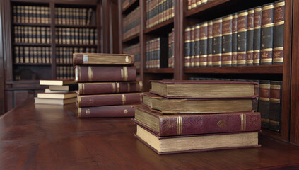 Old hardback law books in rows on wooden library bookshelves with shallow depth of field