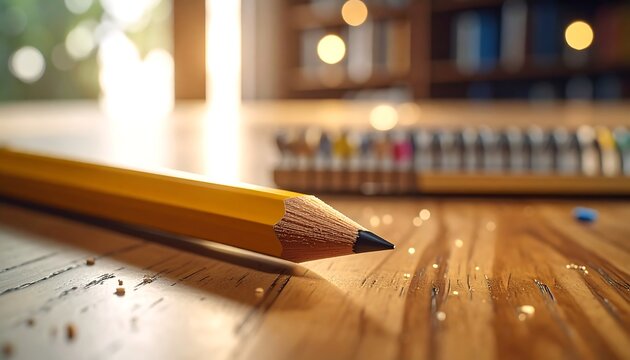 Close-up of sharpened pencil tip touching textured paper surface with shallow depth of field and soft natural lighting