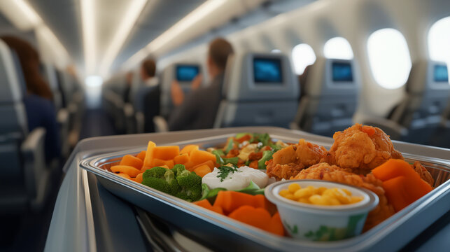 In flight meal tray with healthy fresh balanced food, presented on an airplane tray while passengers enjoy their meal in flight