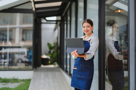 Smiling waitress holding tablet and managing online orders in front of restaurant