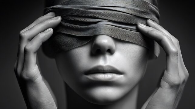 A woman with a blindfold, evoking themes of sight, restriction and perspective