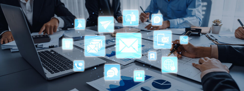 New email notification alerts concept for Digital marketing business communication through virtual inbox and internet technology as Business people use laptop with emails on a virtual screen