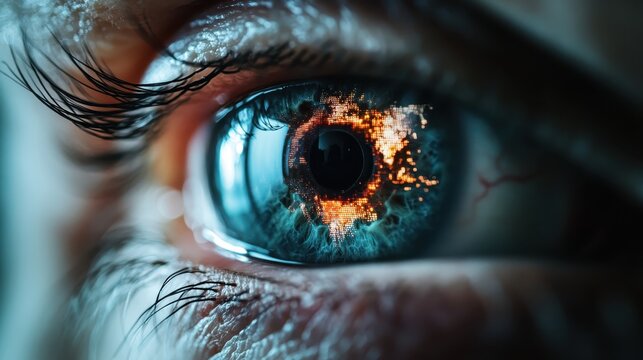 An intense image of an eye reflecting a fiery explosion within its pupil, symbolizing the incendiary power of vision and human emotion in a dramatic context.