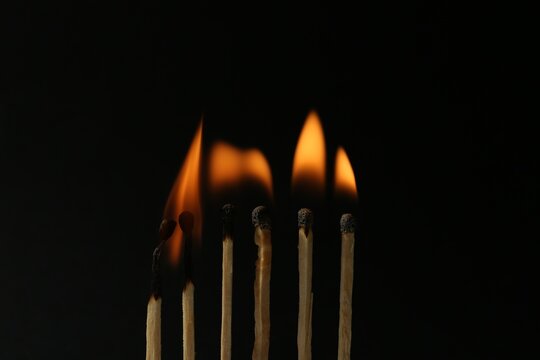 Line of burning matches on black background