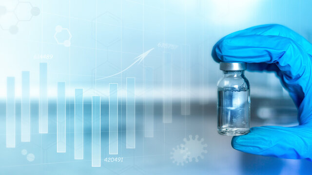 doctor in gloves holds the covid 19 coronavirus vaccine with incidence graph on light background