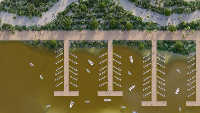 Commercial pier on the edge of a lagoon, with a large incidence of boats, a wooden pier and commercial paths