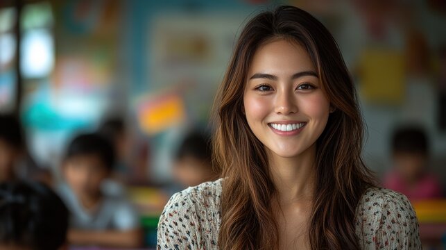 Smiling teacher in classroom engaging with students for a positive learning environment