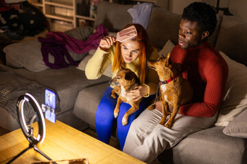 Woman Working In Office Based Business Training Man With Down Syndrome Holding Pet Dachsund Dog