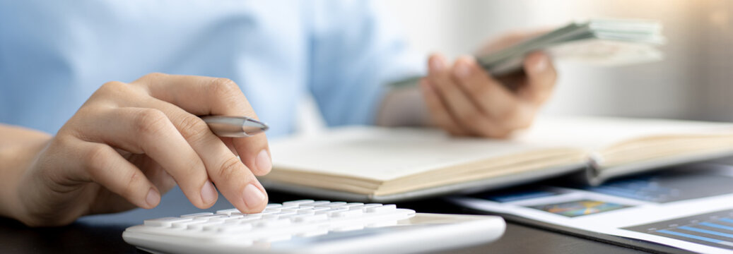 Businesswoman's hand putting coins into a glass jar on a desk in an office, with a calculator and documents nearby The business woman is working out the concept of money