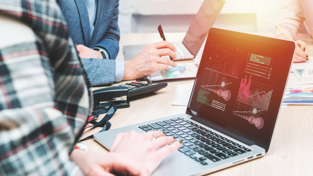 Close up crooped shot of office desk with hands working on laptops