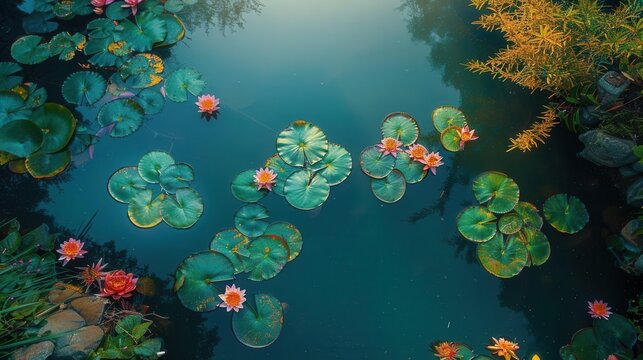 Serene garden of lilies, reflective pond, midday sun, bird's-eye view, vibrant flowers, calm water, wide-angle lens, high-definition