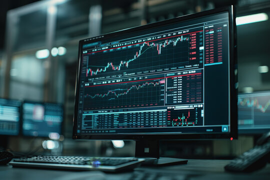 A digital representation of a financial chart showcasing fluctuating market trends with blue tones and grid lines.