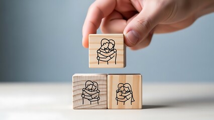 A hand placing a wooden block with a drawing on top of two blocks on a table