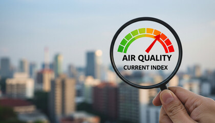 Air quality index showing on smart home domotic tech device. Woman touching touchscreen for clean air breathing purifying filter.