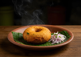 Medu vada, a savory fried doughnut from South India, presents itself steaming hot on a traditional clay plate, accompanied by fresh red onions, exuding culinary delight.