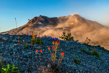 Scenic shot of Mt St Helens with a foreground of Indian paintbrush