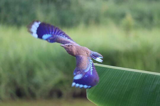 Indian Roller in Flight: A stunning Indian roller, captured in mid-flight, showcases its vibrant blue and brown plumage against a natural backdrop, exuding a sense of freedom and agility.