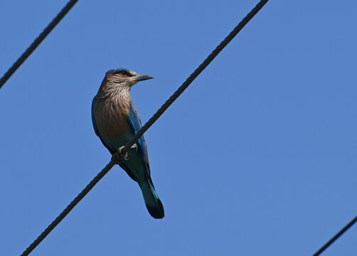 A beautiful indian roller bird is seen perched on an electric wire