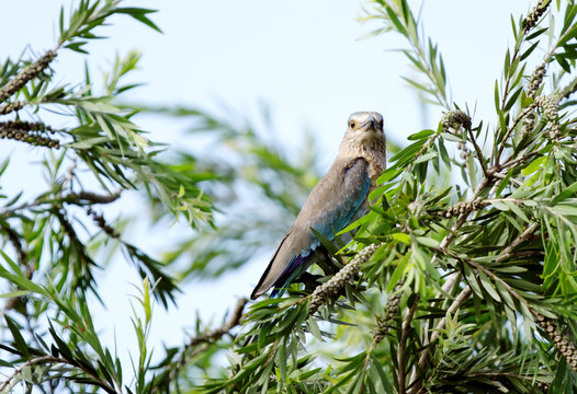 Beautiful Indian Roller (Coracias benghalensis) in a tree of an urban park in Dubai, United Arab Emirates