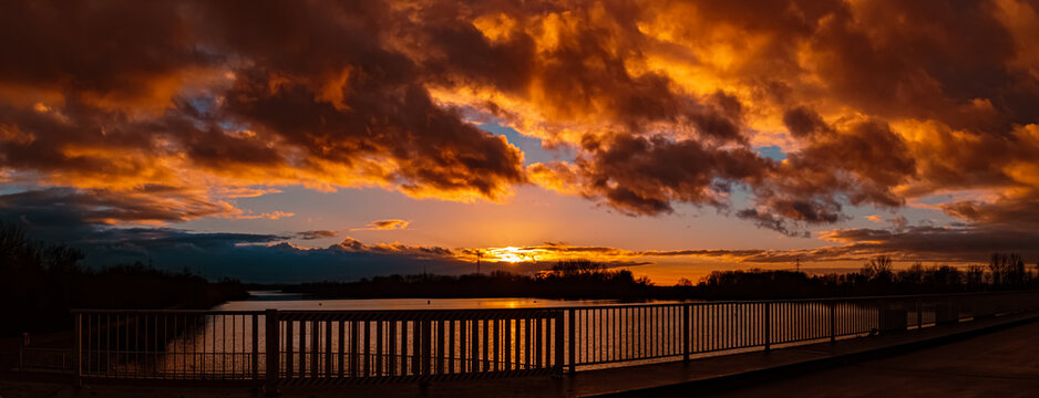 Autumn or indian summer sunset with reflections near Plattling, Isar, Bavaria, Germany
