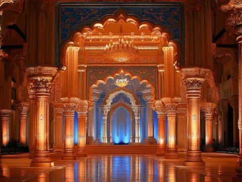 Indian Wedding Royal Stage Decoration, beautiful design, Pastel Shades, royal elements, realistic images, dramatic lighting