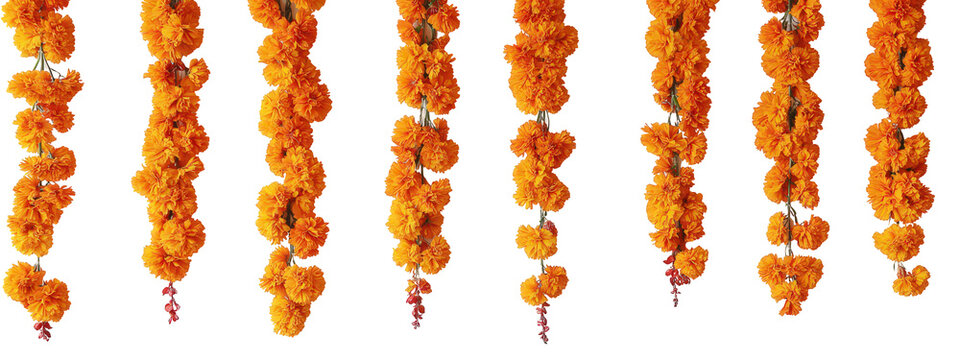 Traditional Indian floral garland toran made of marigold flowers and mango leaves on bright pink background. Happy Diwali festival, Pongal or Gudi Padwa. Decoration for Indian hindu holidays, wedding
