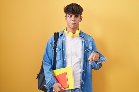 Smiling Man Pointing: A cheerful, young African-American man with a beaming smile points towards the right against a vibrant yellow background.  His expression is inviting and engaging.