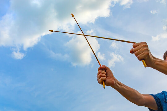Dowsing with metal indicator L rods in hands is a modern tool of a dowser. Pair of Divining rods for radiesthesia technique. An ancient method unproven by science