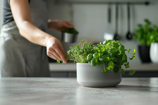A person's hands are carefully tending to lush green herbs growing in stylish concrete pots on a kitchen countertop