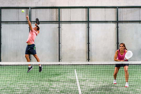 Man and woman engaged in padel tennis match on indoor court
