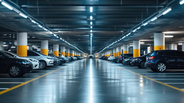 Sci fi looking dark and moody underground parking lot with fluorescent lights on.  Concrete wall