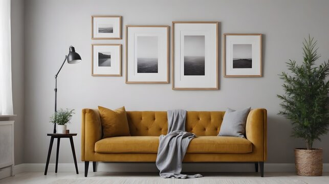A neat and clean living area interior image with orange sofa, table lamp, coffee table, planters and multiple photo frames on the front wall interior template.