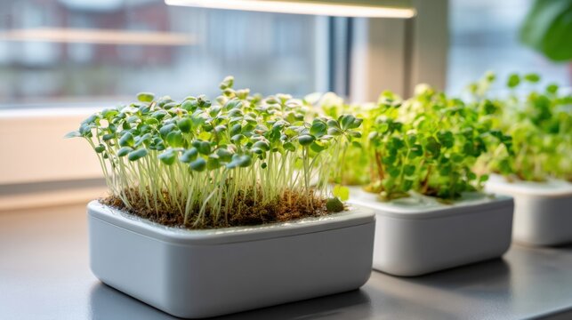 Microgreens thrive in white planters on a sunny windowsill. The vibrant green sprouts soak up natural light, showcasing a healthy indoor gardening setup.
